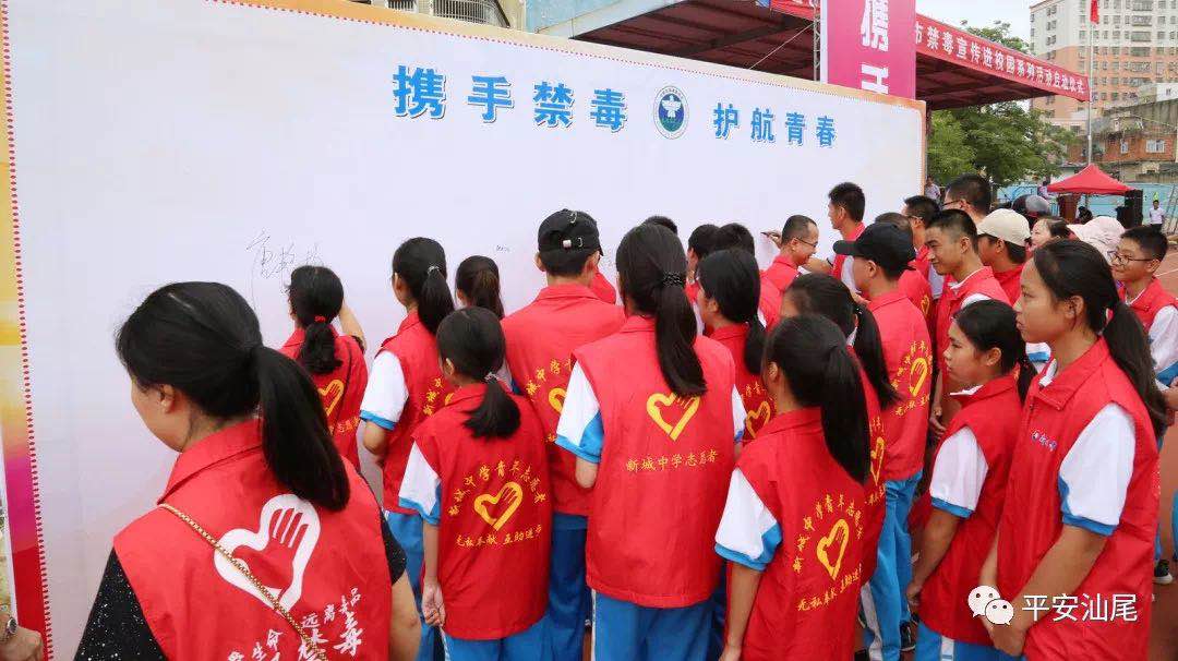 活动中,新城中学学生志愿者代表引领全校2000名学生进行了禁毒宣誓!全区60所学校校长和90名师生志愿者代表在签字墙上签字。启动仪式结束后,同学们热情高涨,分批参与了禁毒教育体验活动,指着毒品模型,围着禁毒讲解员提出各种问题,纷纷惊讶毒品的种类之多、危害之重,表示以后绝不接触毒品,远离各种毒品犯罪活动,并把印有中国禁毒、广东禁毒、汕尾禁毒的微信公众号带回家扫码关注,获取禁毒知识,提高识毒、拒毒、防毒的意识。