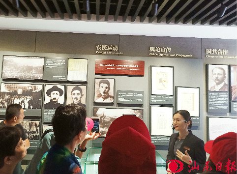 中共“二大”纪念馆彭湃烈士像前,红色讲解员讲解海陆丰农民运动史。
