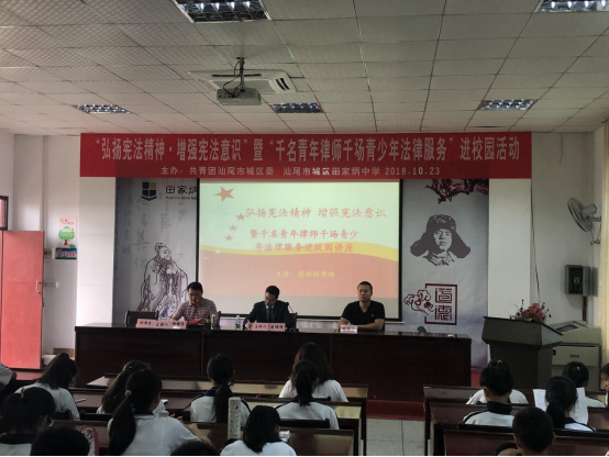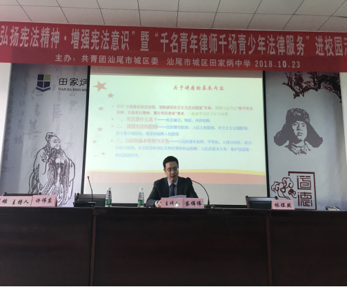 为落实党的十九大精神,做好宪法学习宣传教育和贯彻实施活动,再掀宪法宣传教育新高潮,我委于10月23日在汕尾市城区田家炳中学举办“弘扬宪法精神·增强宪法意识”暨“千名青年律师千场青少年法律服务”进校园活动,并邀请了蔡伟伟律师为同学们现身说法。