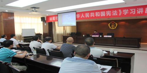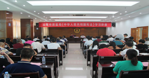 为深入贯彻习近平新时代中国特色社会主义思想和党的十九大精神,履行领导干部要做尊法学法守法用法的模范的行政执法理念,汕尾市质监局近期举办主题为“忠于宪法 遵守宪法 维护宪法”的宪法学习讲座,邀请中共汕尾市委党校法学教研室主任吴伟平副教授到该局作辅导学习,该局机关、市质计所和省特检院汕尾检测院干部职工共有200多人参加这次学习讲座。