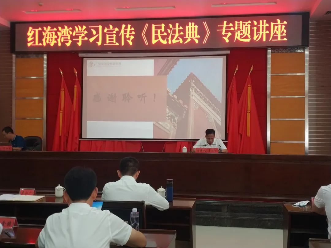 7月19日下午,我区开展《民法典》专题法治讲座,深入学习贯彻习近平总书记在中央政治局第二十次集体学习时的重要讲话精神,邀请广东宝城律师事务所彭扬武律师对全区200多名干部职工进行辅导授课,更好地推动民法典实施。区党工委副书记、管委会副主任、政法委书记卓江广主持,全区副科级以上干部及各街道、村(社区)领导干部参加。