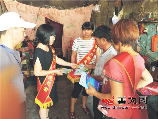 志愿者进村入户,向村民派发禁毒、“创文”宣传资料