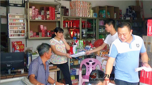 宣传队伍到商户中发放扫黑除恶宣传单。