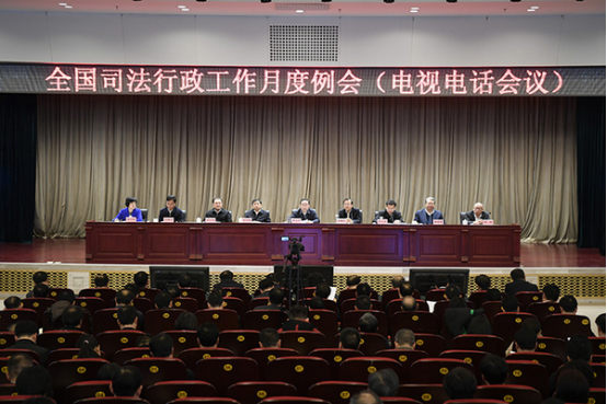 图为司法部召开全国司法行政工作月度例会(电视电话会议)现场。