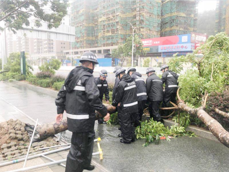 9月16日,受台风“山竹”影响,市区部分路段树木倒伏,交通受阻。市城管执法局迅速派出人员对市区各路段进行排查,积极投入到道路清障工作中。图为市城管人员冒雨清理汕尾大道倒伏树木。