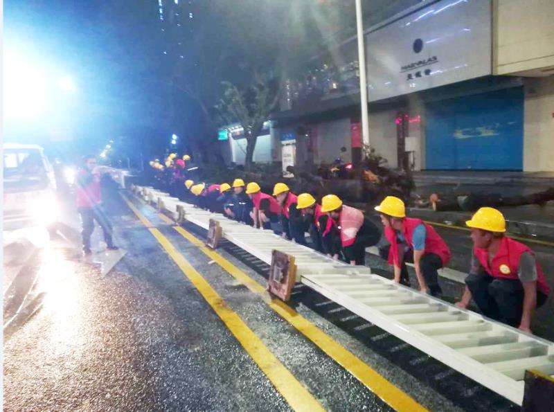 9月16日晚上,我市多个部门以及志愿者组织迅速开展抗灾复产工作。图为城区团委组织的志愿者在市区公园路合力扶起倒伏的交通隔离栏。