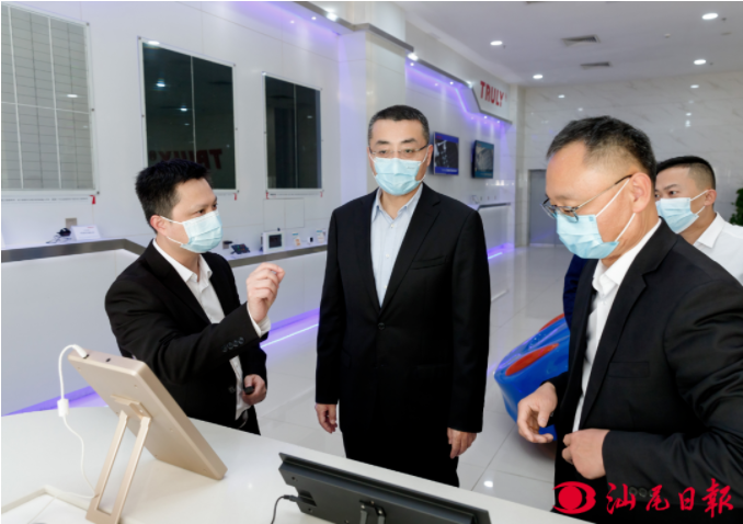 在信利半导体有限公司高端车载及智能终端显示屏工厂,逯峰听取汕尾高新区发展情况汇报,详细了解企业生产运营情况及六代线项目相关筹建工作进度,勉励企业要坚定发展信心,继续深耕、领跑细分领域市场,着力攻克关键核心技术,不断推出新产品,提高自主创新能力和核心竞争力;充分发挥行业龙头企业优势,围绕延链、补链、强链强化以商招商、以链招商,积极引进产业链上下游项目落户汕尾。要求汕尾高新区要突出制造业当家,坚持抓好大产业、大平台、大项目、大企业、大环境,强化平台支撑作用,持续深化“放管服”“亩均论英雄”等改革,推动各类资源要素向平台集聚,为产业高质量发展提供有力保障。要精准对接企业需求,深化“店小二”服务,严格落实领导挂点联系企业和驻企指导员驻点对接企业制度,加强用工、用地、资金等要素保障,着力打造“四个一流”营商环境,助推企业扎根汕尾,持续做大做强。