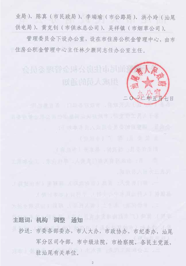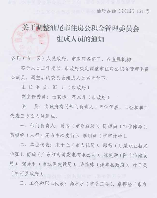 关于调整汕尾市住房公积金管理委员会组成人员的通知