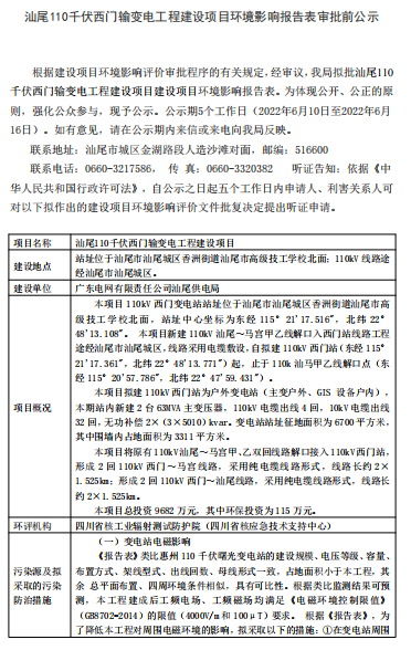 汕尾110千伏西门输变电工程建设项目环境影响报告表审批前公示
