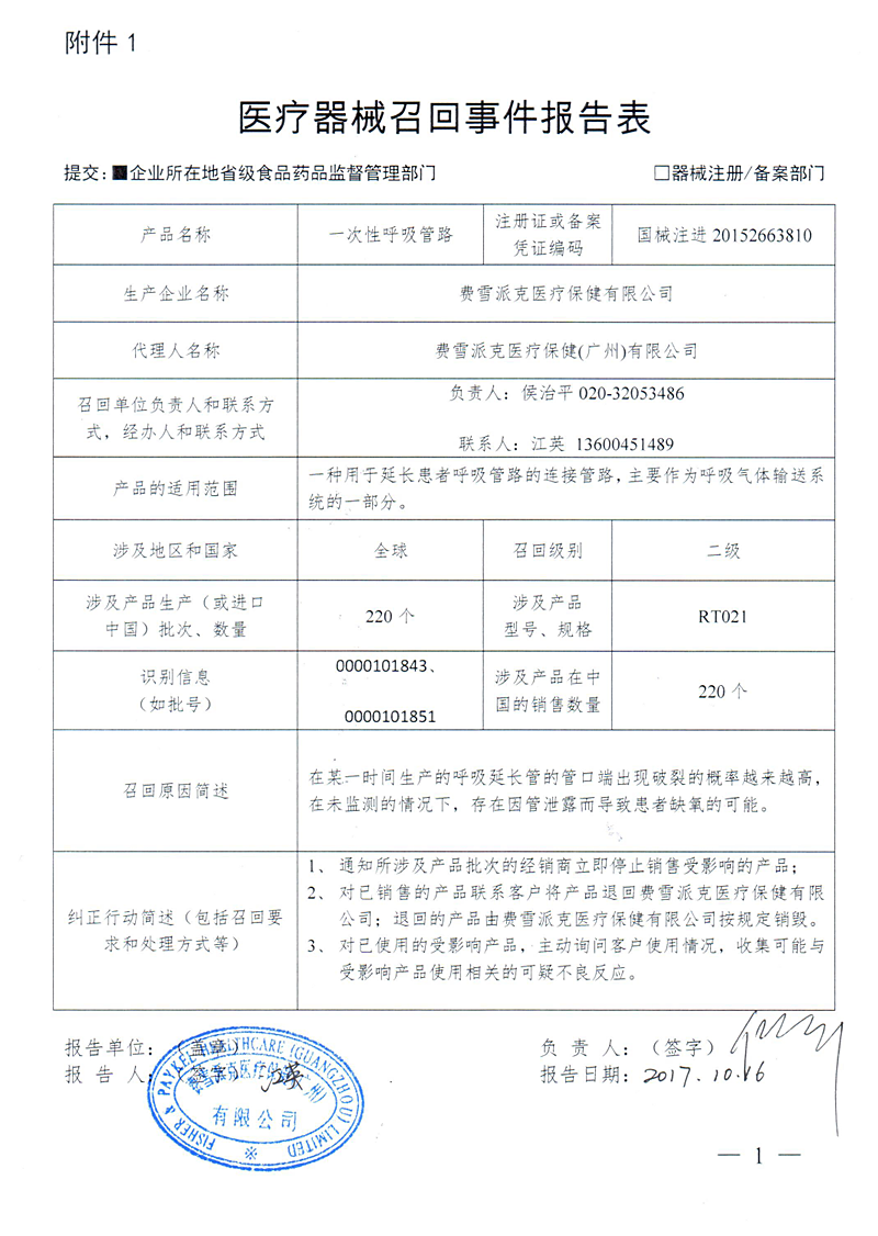 费雪派克医疗保健(广州)有限公司报告,由于某一时间生产的呼吸延长管的管口端出现破裂的概率越来越高,在未监测的情况下存在因管泄露而导致患者缺氧的可能,费雪派克医疗保健有限公司对其生产的一次性呼吸管路(注册证号:国械注进20152663810)主动召回。召回级别为二级。涉及产品的型号、规格及批次等详细信息见《医疗器械召回事件报告表》。