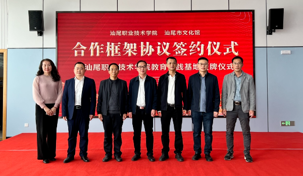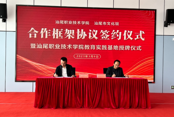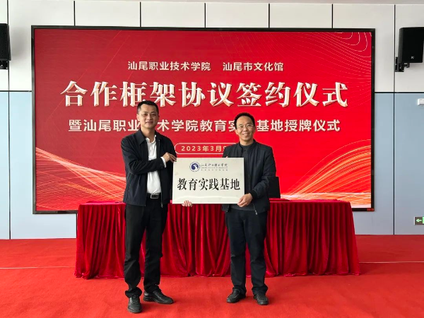 3月9日下午,汕尾职业技术学院与汕尾市文化馆在市文化馆活动中心联合签订了合作框架协议,并顺利举行“汕尾职业技术学院教育实践基地”授牌仪式。市文化广电旅游体育局党组成员、市文化旅游体育发展中心主任林树专,汕尾职业技术学院人文学院院长罗景泉,以及有关人员、学员代表参加了活动。黄派生馆长代表市文化馆与汕尾职业技术学院签订协议并接受牌匾。