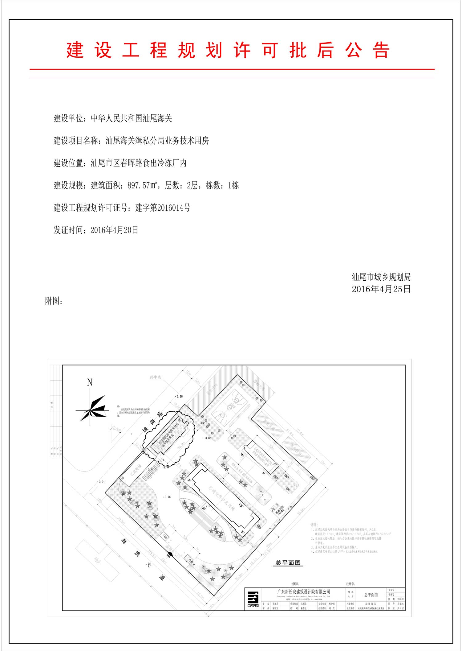 汕尾海关缉私分局业务技术用房建设工程规划许可批后公告