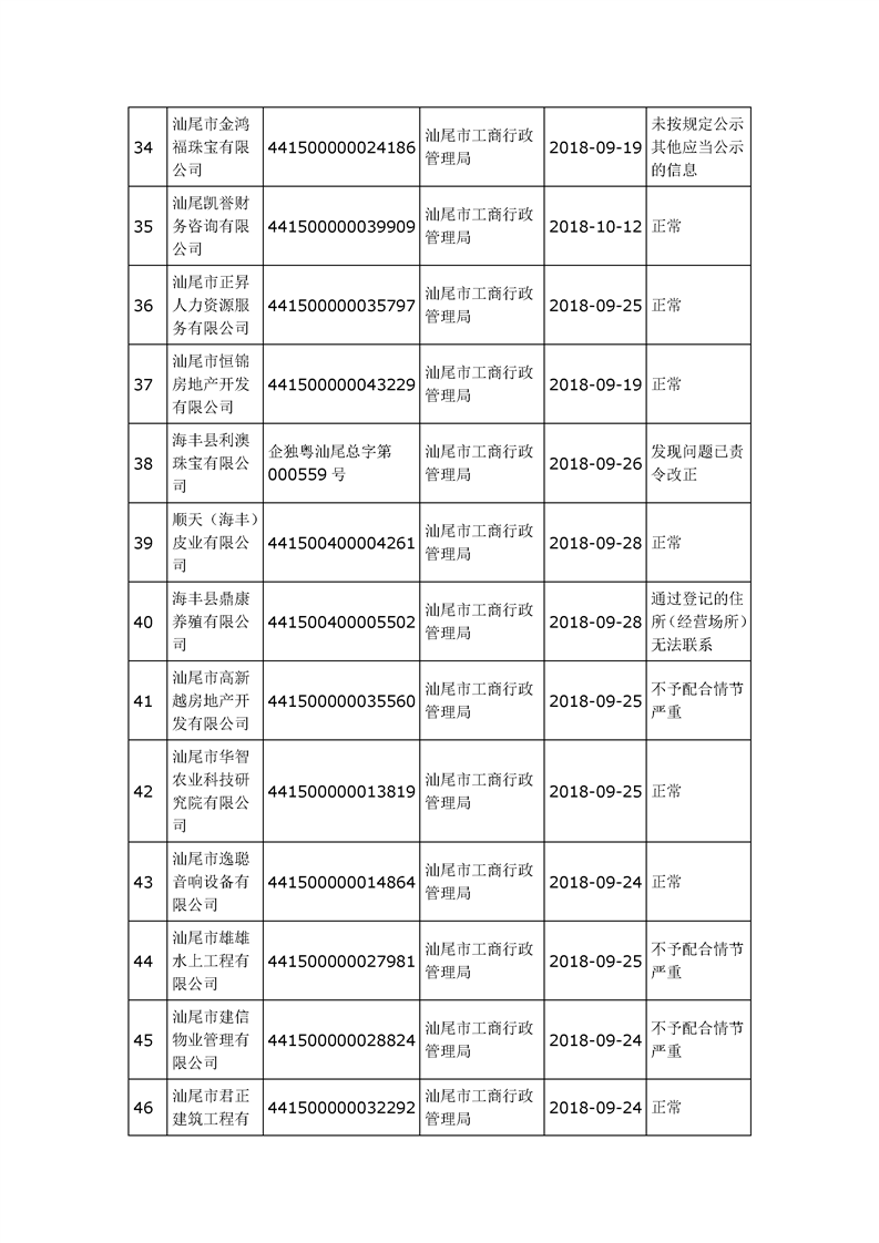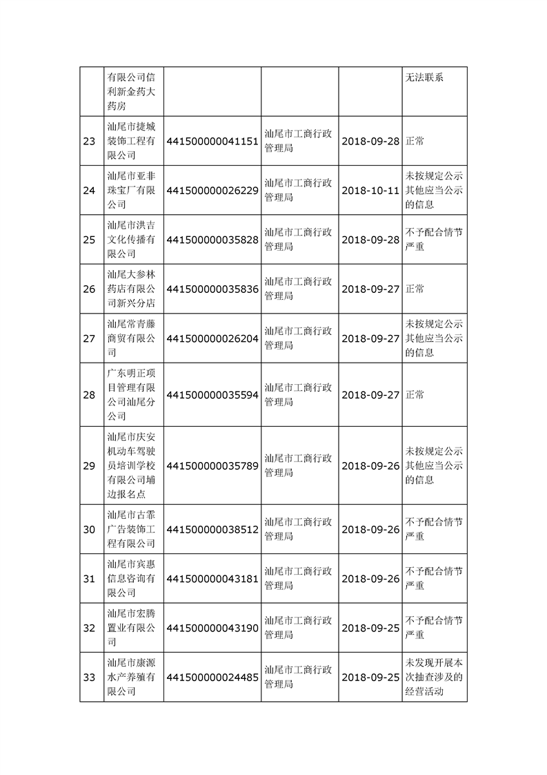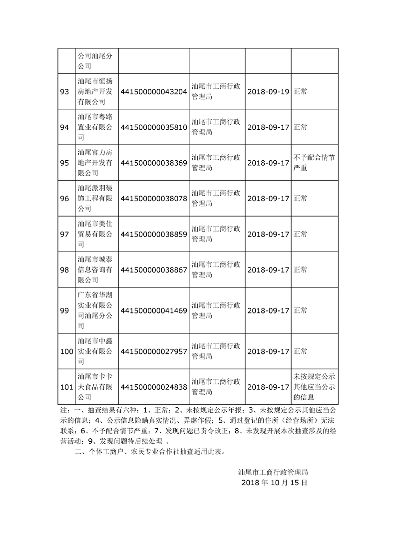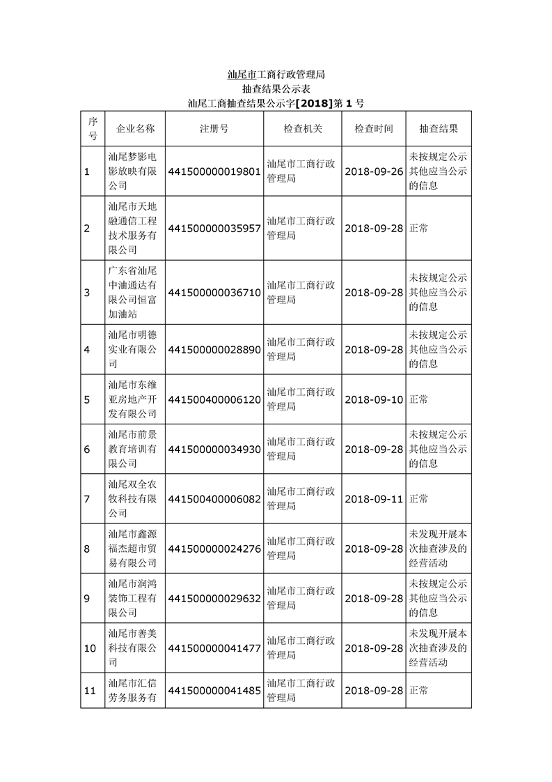 汕尾市工商行政管理局抽查结果公示【2018】第1号