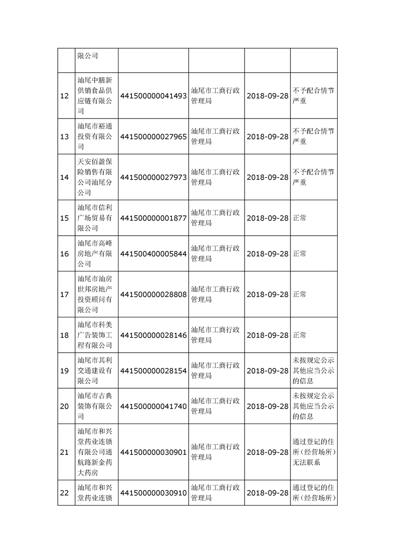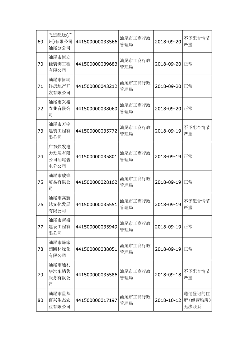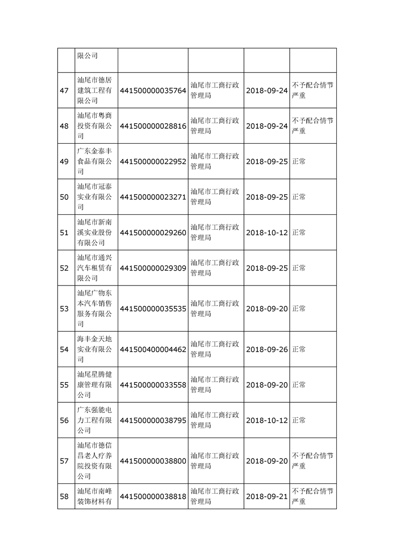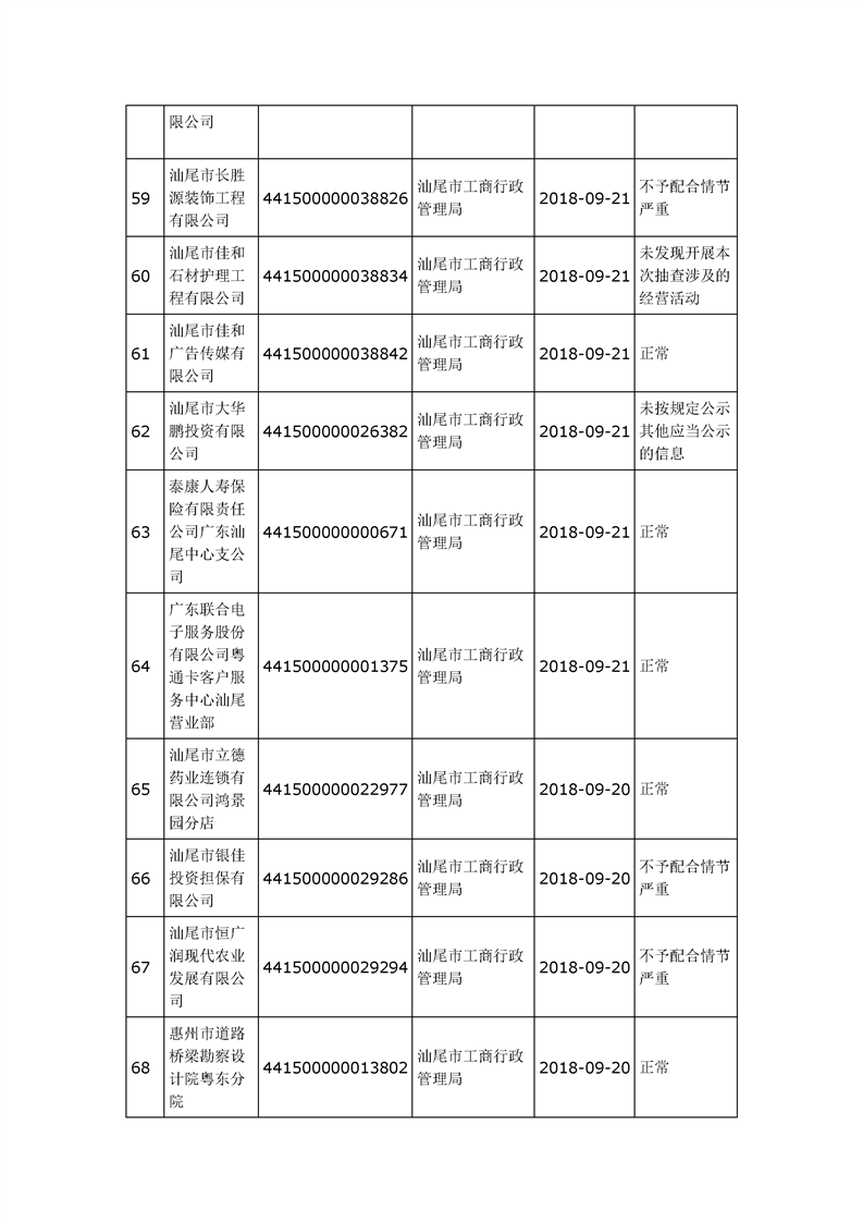 汕尾市工商行政管理局抽查结果公示【2018】第1号