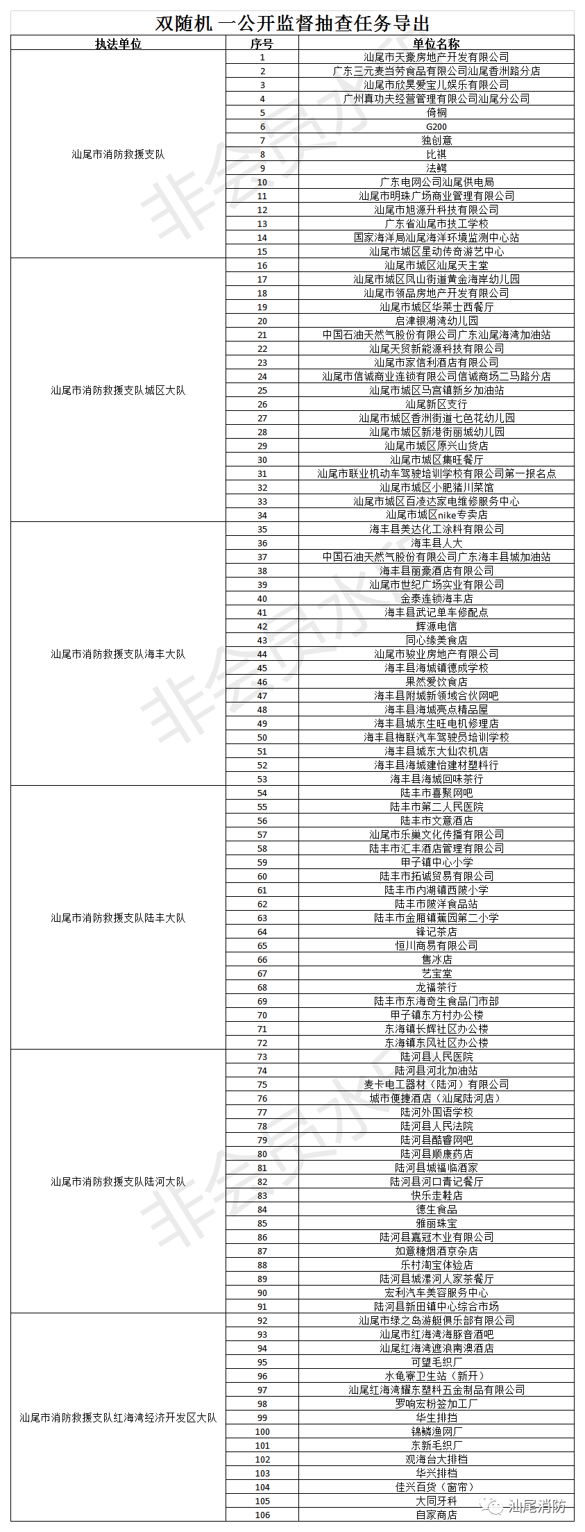 根据应急管理部消防救援局《关于全面推行“双随机、一公开”消防监管工作的通知》(应急消〔2019〕241号)及省消防救援总队《全面推行“双随机、一公开”消防监管工作方案》的统一部署,我市消防支队从2019年10月1日起全面推行“双随机、一公开”消防监管工作模式。根据相关要求,现将2020年5月份“双随机、一公开”抽查计划公开如下: