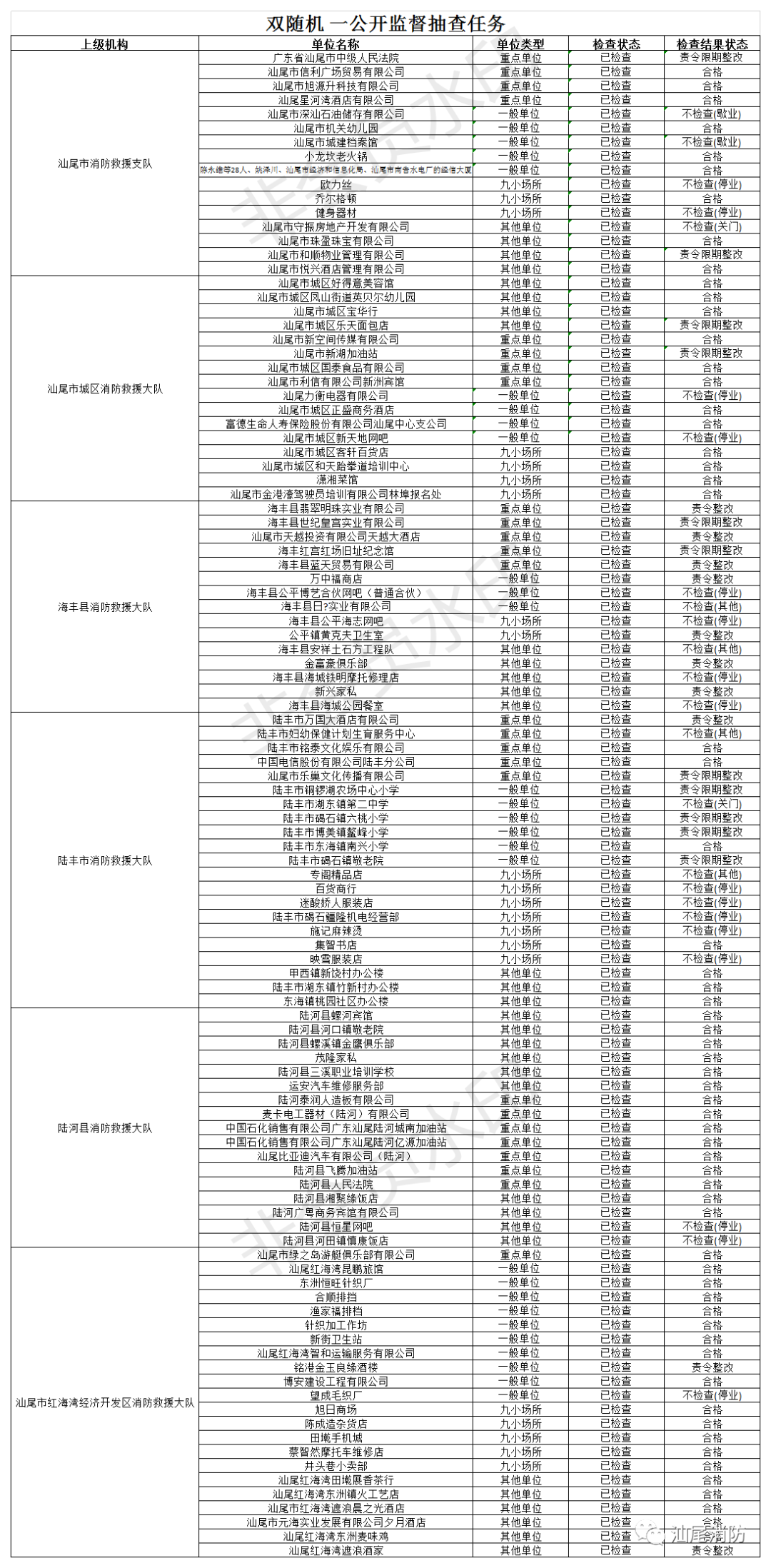 为深入推进全市火灾防控工作,进一步预防和减少火灾危害,保障公共安全,督促各单位、各场所履职尽责,根据有关法律法规规定,汕尾市消防救援支队依法对汕尾市有关单位进行消防监督抽查,现将2020年8月份“双随机、一公开”消防监督抽查结果公示如下: