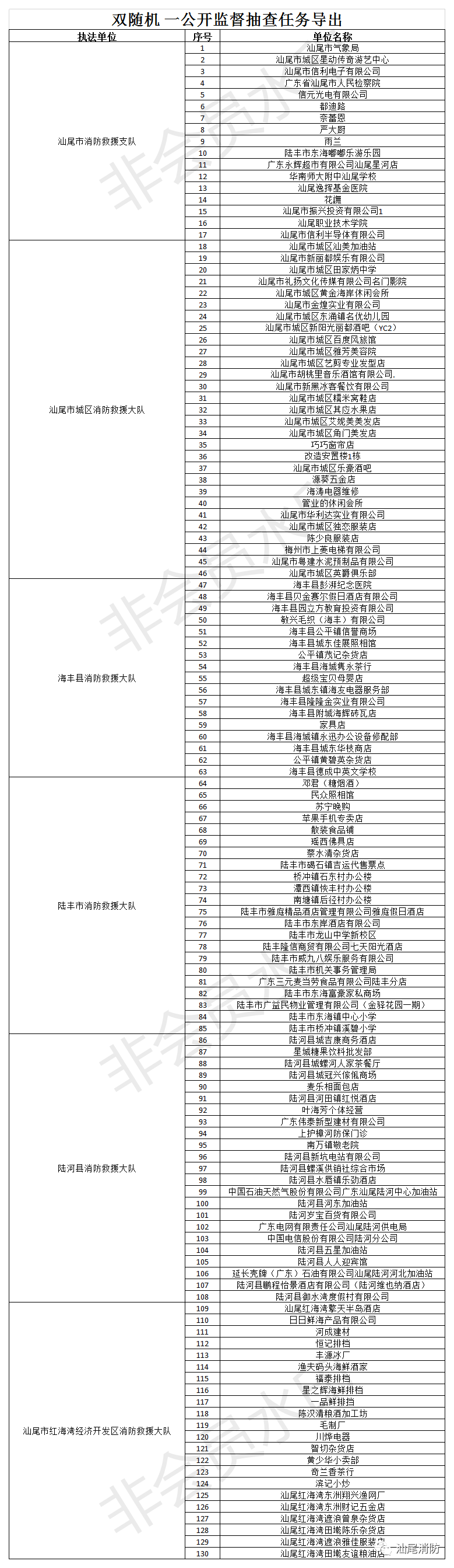 根据应急管理部消防救援局《关于全面推行“双随机、一公开”消防监管工作的通知》(应急消〔2019〕241号)及省消防救援总队《全面推行“双随机、一公开”消防监管工作方案》的统一部署,我市消防支队从2019年10月1日起全面推行“双随机、一公开”消防监管工作模式。根据相关要求,现将2020年9月份“双随机、一公开”抽查计划公开如下: