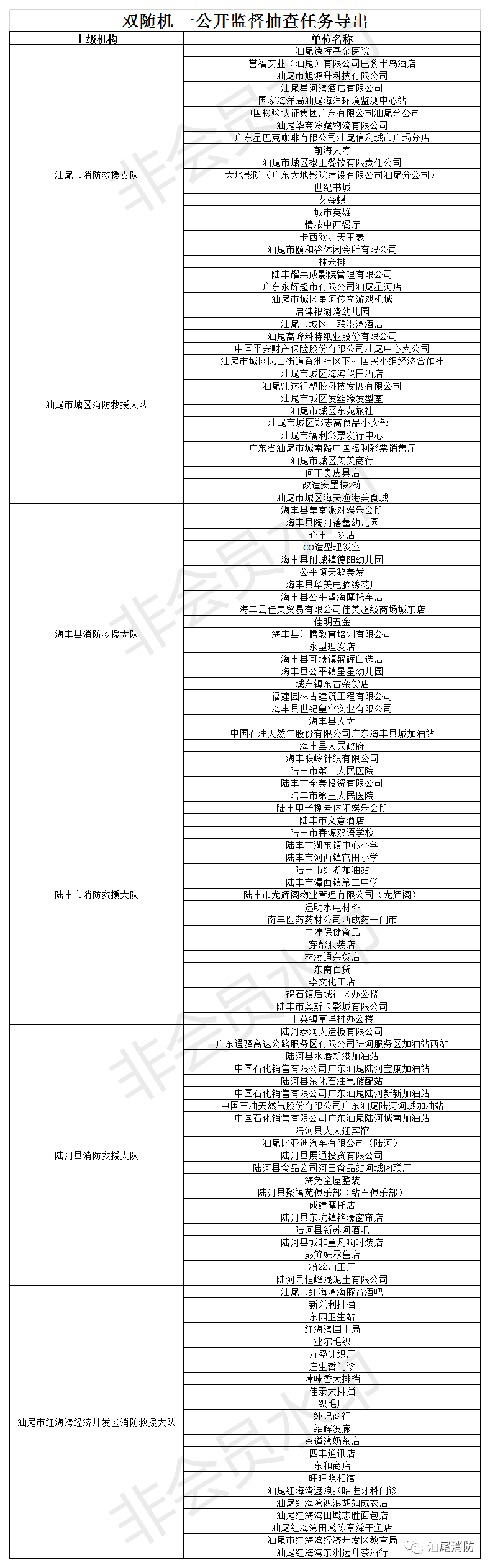 根据应急管理部消防救援局《关于全面推行“双随机、一公开”消防监管工作的通知》(应急消〔2019〕241号)及省消防救援总队《全面推行“双随机、一公开”消防监管工作方案》的统一部署,我市消防支队从2019年10月1日起全面推行“双随机、一公开”消防监管工作模式。根据相关要求,现将2020年11月份“双随机、一公开”抽查计划公开如下: