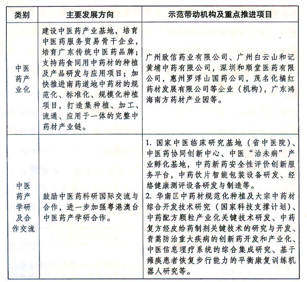 12.加快中医药产业化发展。培育壮大广东传统中医药品牌,打造中医药产业基地。完善广东特色中药材标准体系和中医诊疗设备注册审批标准,加强药食同用中药材的种植及产品研发与应用。加快推进南药道地中药材的规范化、标准化、规模化种植,打造集种植、加工、流通、应用于一体的完整中药材产业链。培育中医药服务贸易骨干企业,促进中医药服务贸易发展,鼓励中医药企业通过对外贸易、境外参展、商标注册、国际认证等方式,扩大中医药产品、技术和服务出口。(省中医药局、食品药品监管局负责,省经济和信息化委、卫生计生委、科技厅、商务厅参与)