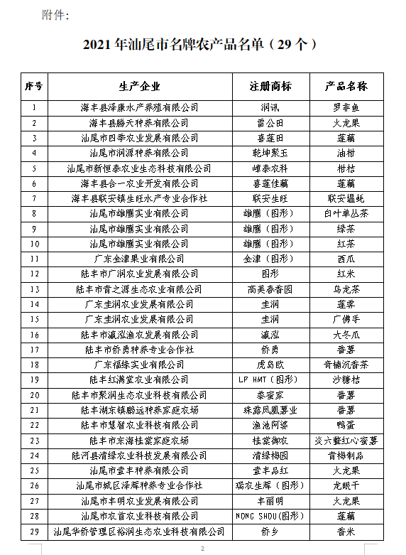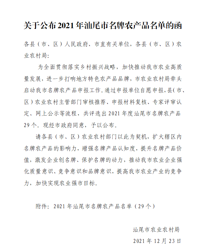 关于公布2021年汕尾市名牌农产品名单的函