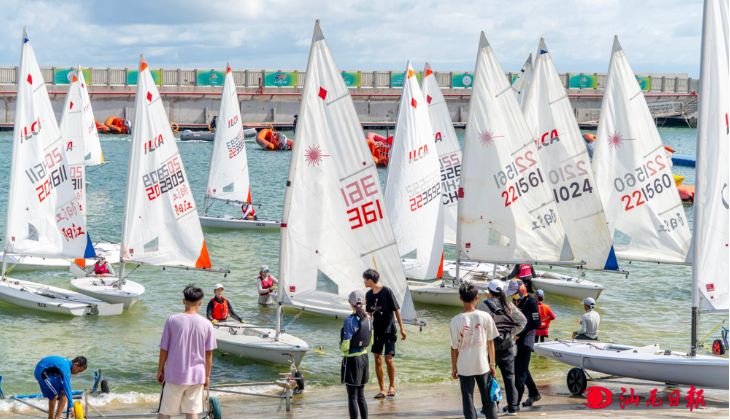 在海训中心下水坡道前,一艘艘帆船整齐列阵。各队参赛运动员认真检查船只状况、调试帆具,随后陆续扬帆出海。运动员们重点感受红海湾海域的风向、风速以及水流特点,以尽快适应竞赛水域。