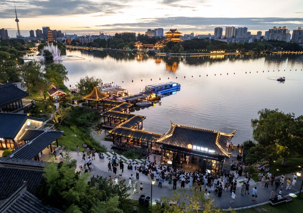6月28日,人们在泰州市海陵区桃园景区游玩(无人机照片)。
