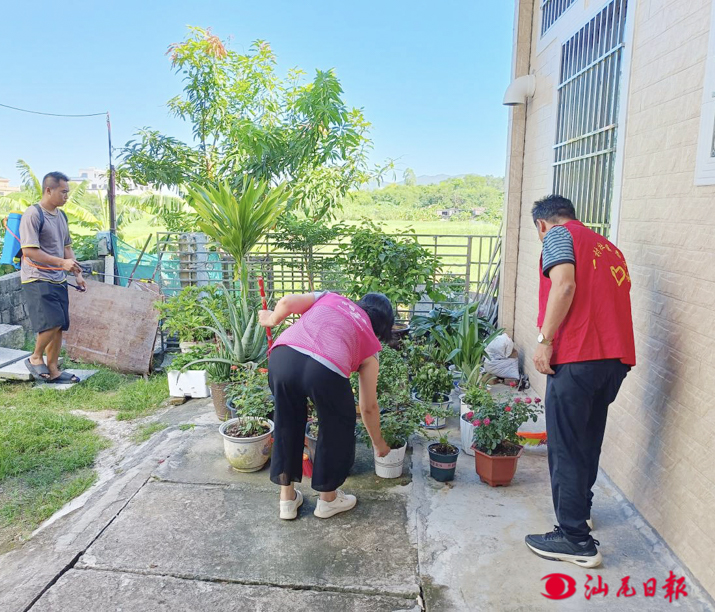 红海湾经济开发区党员干部协助村民清理门前屋后花盆。