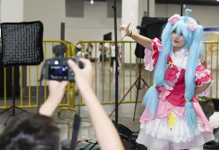 在上海举行的2025年中国国际动漫游戏博览会上,扮装者在摄影区拍照(7月4日摄)。