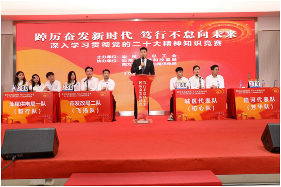 本次知识竞赛活动重点围绕党的二十大报告中的新观点、新论断、新思想等相关知识点出题,对选手学习党的二十大精神进行全面测试,共有8个参赛队伍24名参赛选手参加竞赛。竞赛现场,参赛选手展现出扎实的理论基础和奋勇争先的精神风貌。必答题环节,选手们沉着稳重、对答如流,充分展现了丰富的知识储备;抢答题环节,选手们铆足干劲、眼疾手快,把对知识掌握的自信凝聚到团结协作上,比分不断拉开又追平,赛场紧张刺激的氛围感拉满;风险题环节,选手们挑战自我,选择不同分数档的题目将分数拉开,推动比赛进入白热化,赢得了一片喝彩和掌声。活动现场还设置了有奖互动环节,现场观众纷纷举手抢答党的二十大知识题目,将赛场气氛不断推上新高潮。经过激烈角逐,最终汕尾供电局二队、陆丰代表队、陆河代表队及市发改局一队包揽前三名。