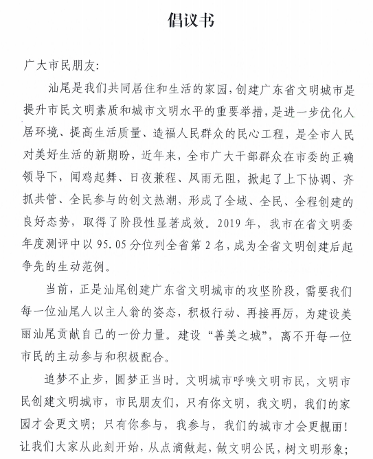 关于进一步做好我市创建广东省文明城市社会宣传工作的倡议书