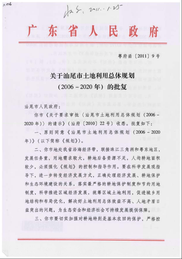 关于汕尾市土地利用总体规划(2006~2020年)的批复