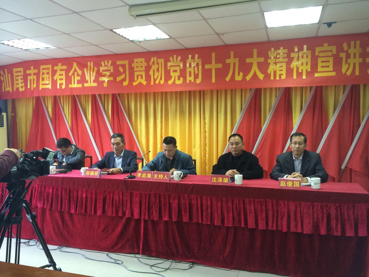 2018年1月2日,汕尾市国有企业学习贯彻党的十九大精神宣讲报告会在汕尾市南告水电有限责任公司举行。市委宣讲团成员、市委党校讲师张路做宣讲报告。市国资委党委书记李启海主持报告会,市直工委书记沈泽雄、副书记赵俊国、市南告水电有限责任公司党委书记郑镇旺出席报告会。