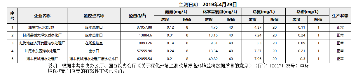 2019年4月29日汕尾市国控重点污染源废水企业自动监控数据报表