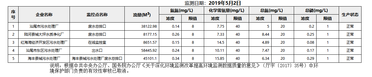 2019年5月2日汕尾市国控重点污染源废水企业自动监控数据报表