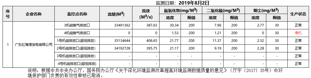 2019年8月2日汕尾市国控重点污染源废气企业自动监控数据报表