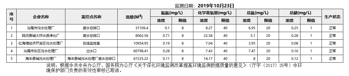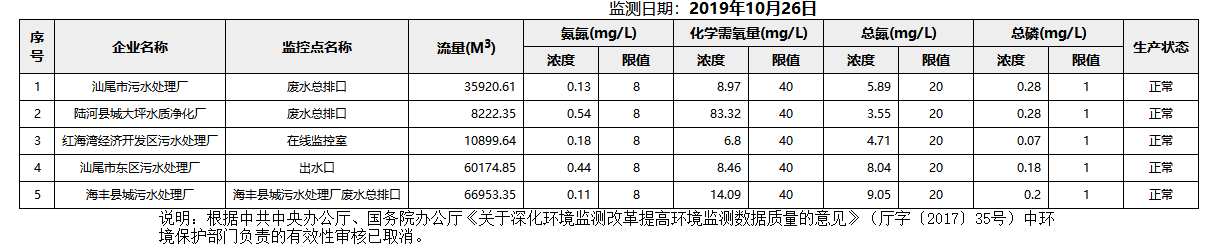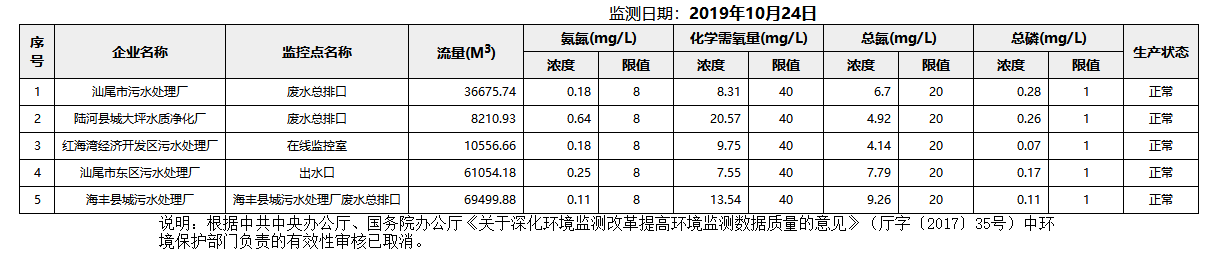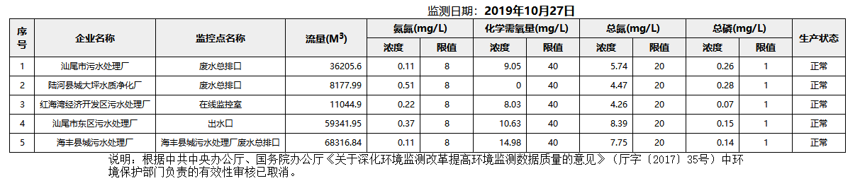 2019年10月21-27日汕尾市国控重点污染源废水企业自动监控数据报表