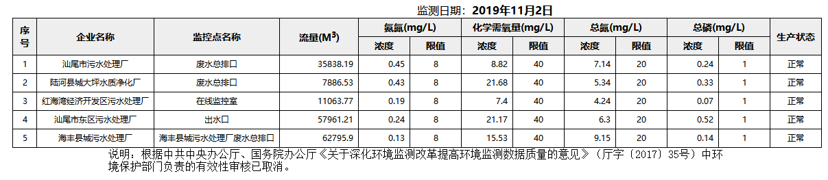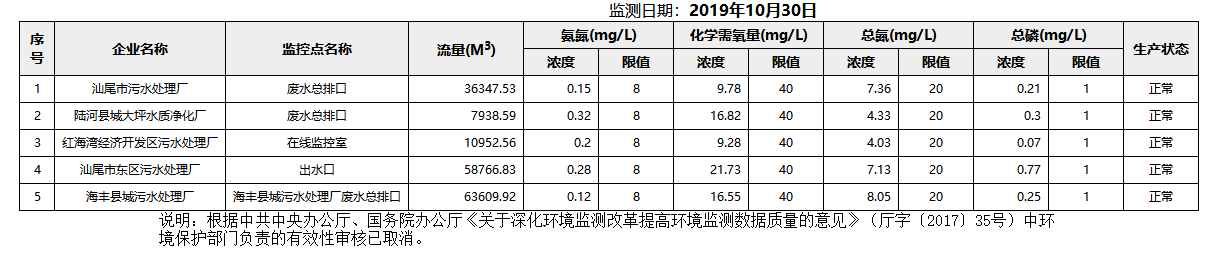 2019年10月28日-11月3日日汕尾市国控重点污染源废水企业自动监控数据报表