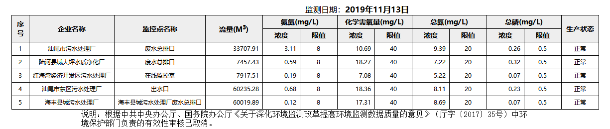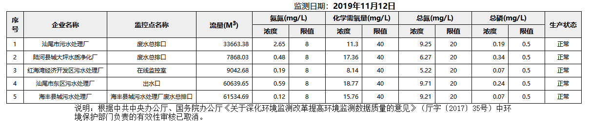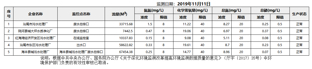 2019年11月11-17日汕尾市国控重点污染源废水企业自动监控数据报表