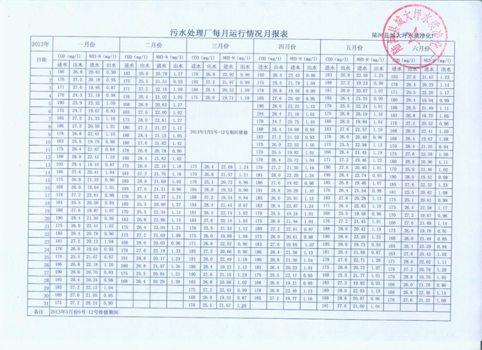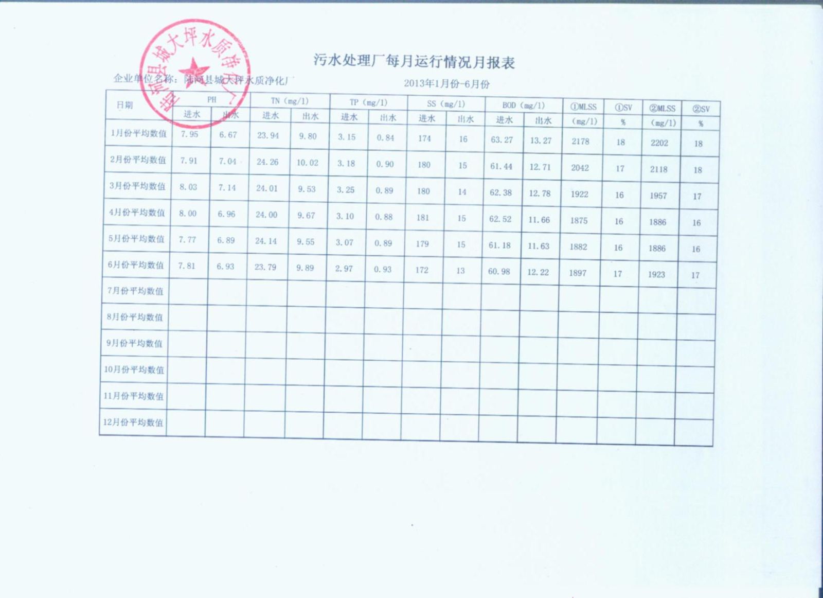汕尾市陆河县大坪水质净化厂1-6月自行监测情况月报表
