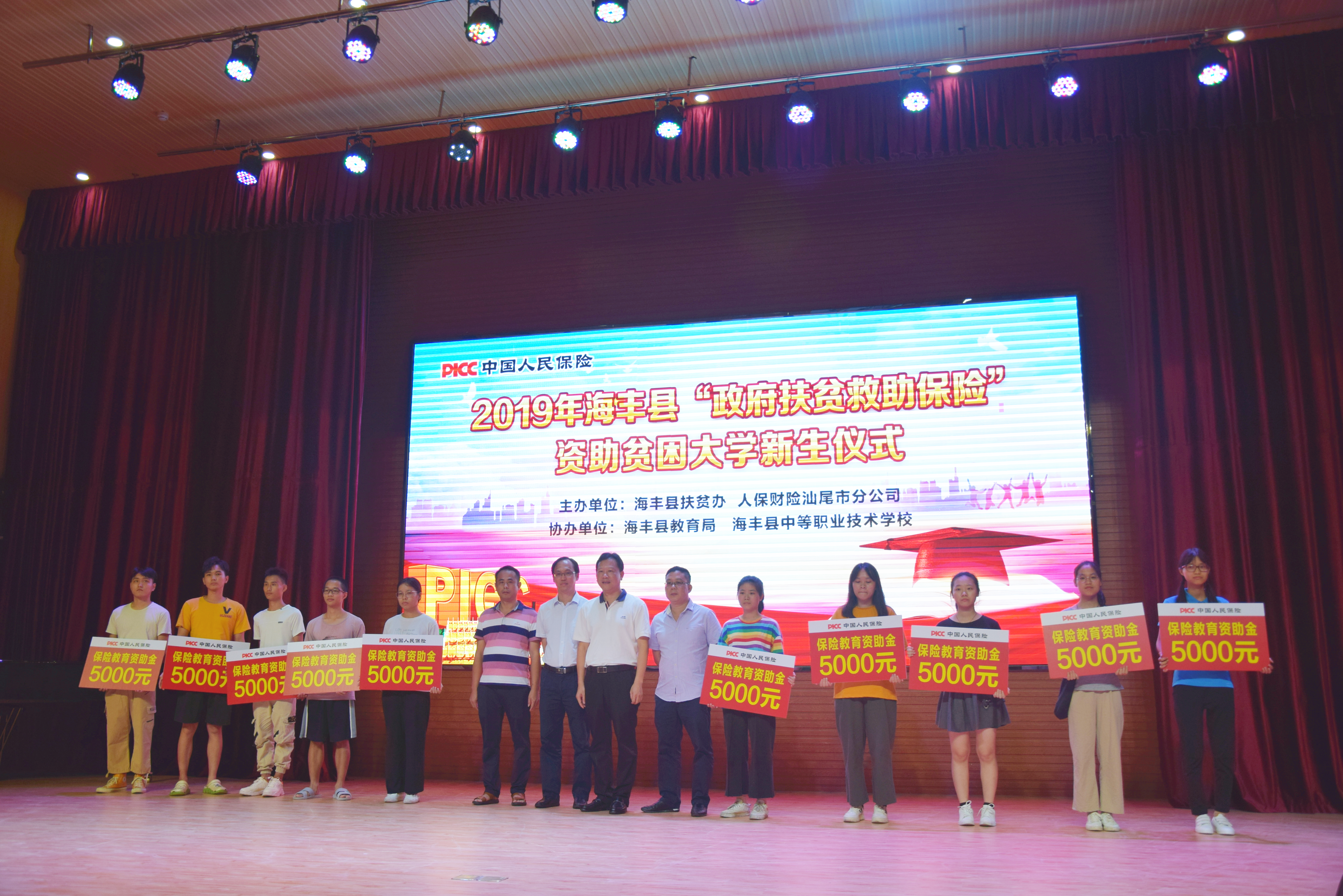 8月27日上午,海丰县扶贫办与人保财险汕尾市分公司在海丰县中等职业技术学校联合主办2019年海丰县“政府扶贫救助保险”资助贫困大学新生仪式,向该县符合资助条件的124名贫困家庭大学新生每人发放5000元资助款,共计62万元。