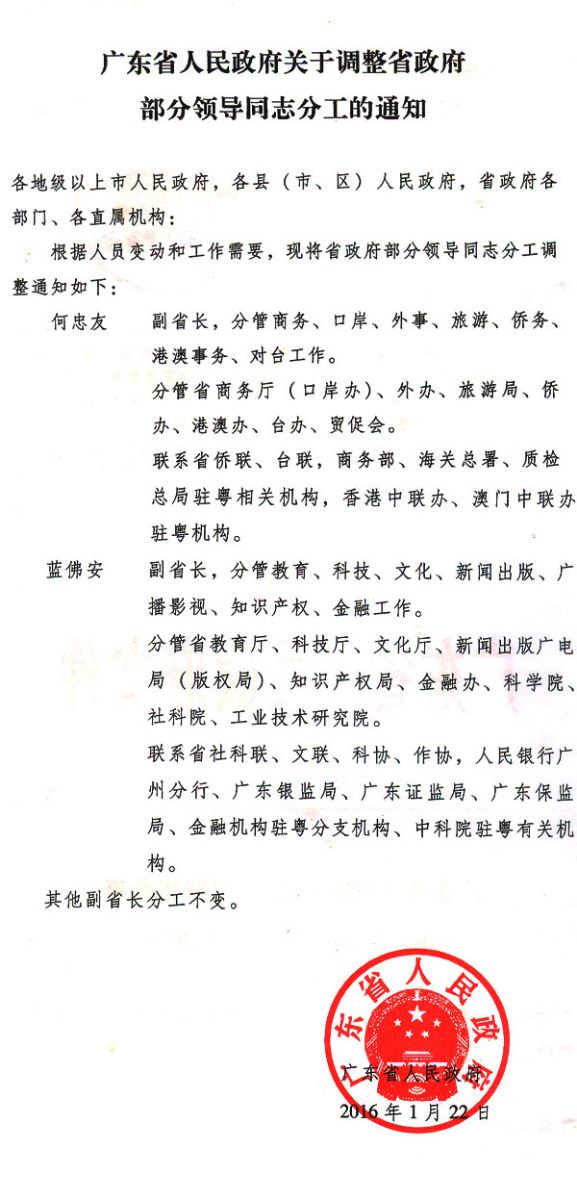 广东省人民政府关于调整省政府部分领导同志分工的通知