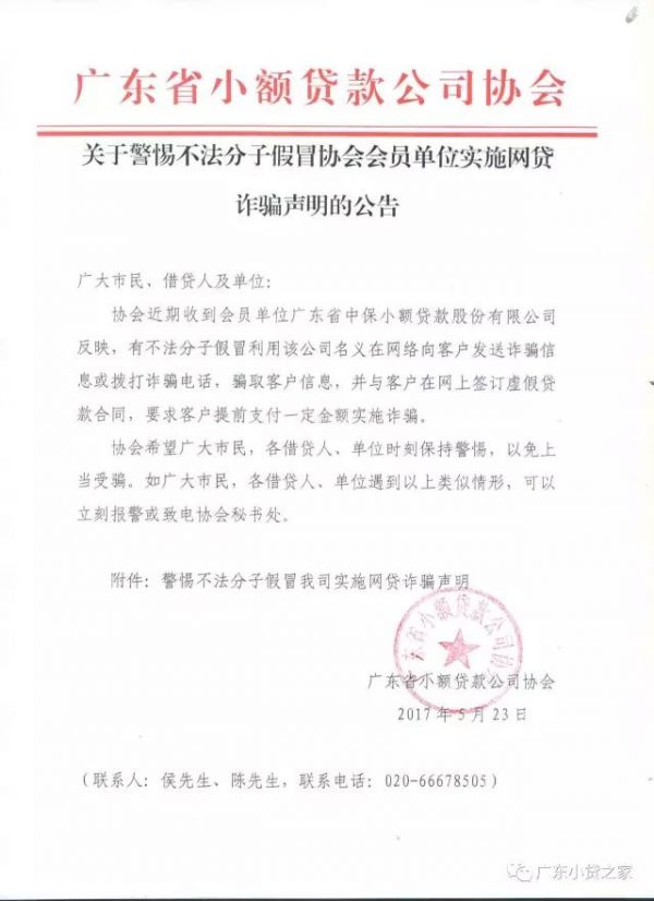 关于警惕不法分子假冒广东省小额贷款公司协会会员单位实施网贷诈骗声明的公告