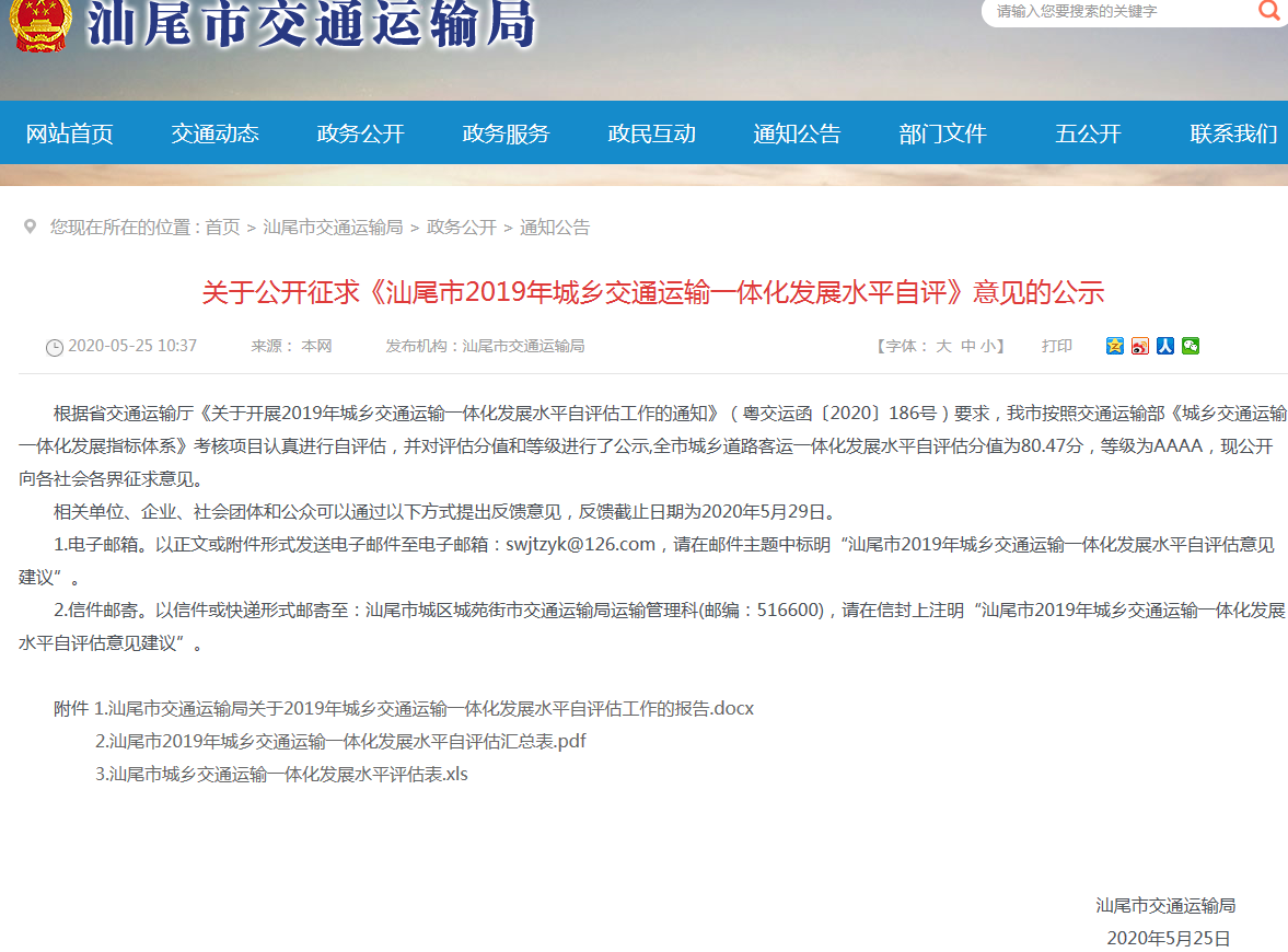 汕尾市2019年城乡交通运输一体化发展水平自评估情况在“汕尾市交通运输局公众网”进行公示,经公示无异议。