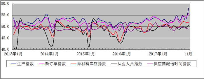 图2 2013年1月—2017年11月广东省制造业PMI分项指数趋势图
