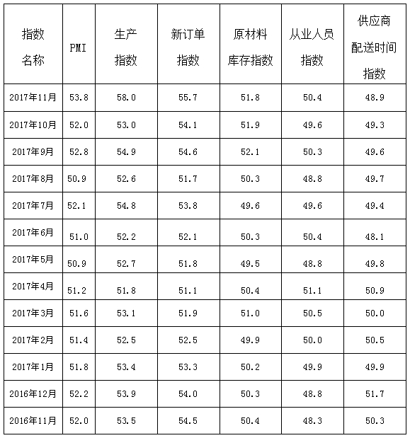 表2016年11月—2017年11月广东省制造业PMI主要分项指数值表