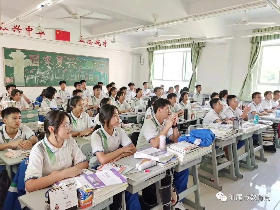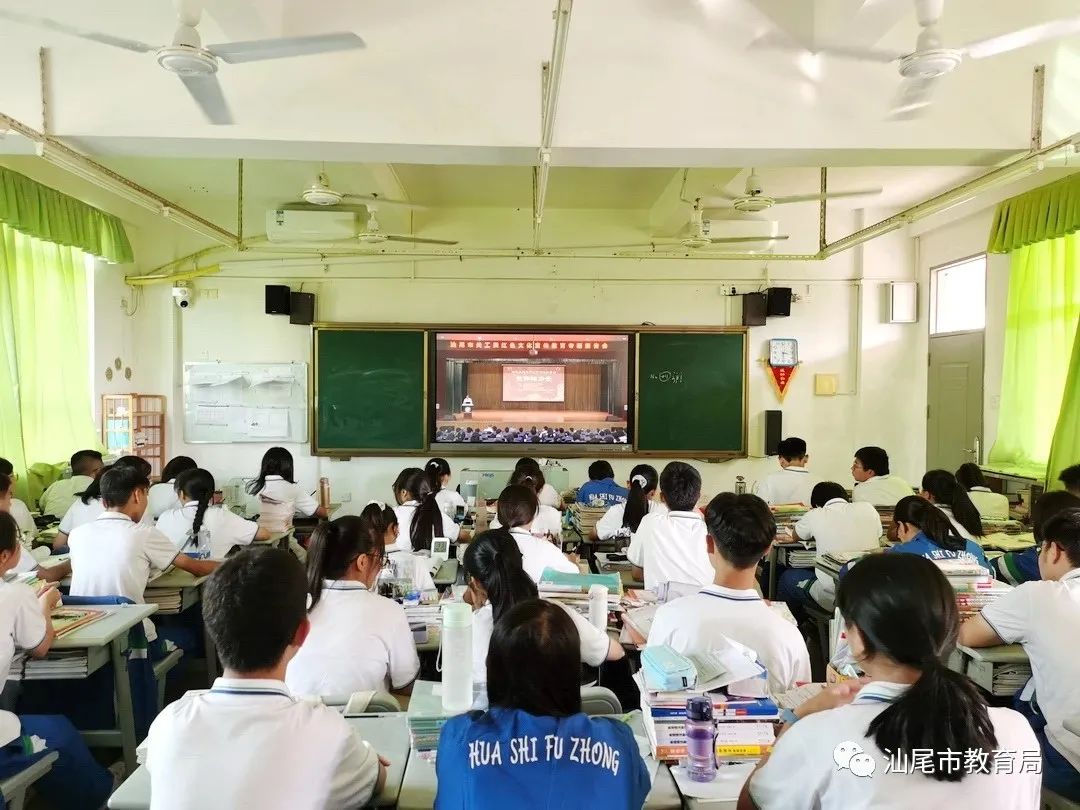 华南师大附中汕尾学校领导班子成员与高一年级全体师生在现场共同聆听报告,其余师生通过网络直播在教室观看。