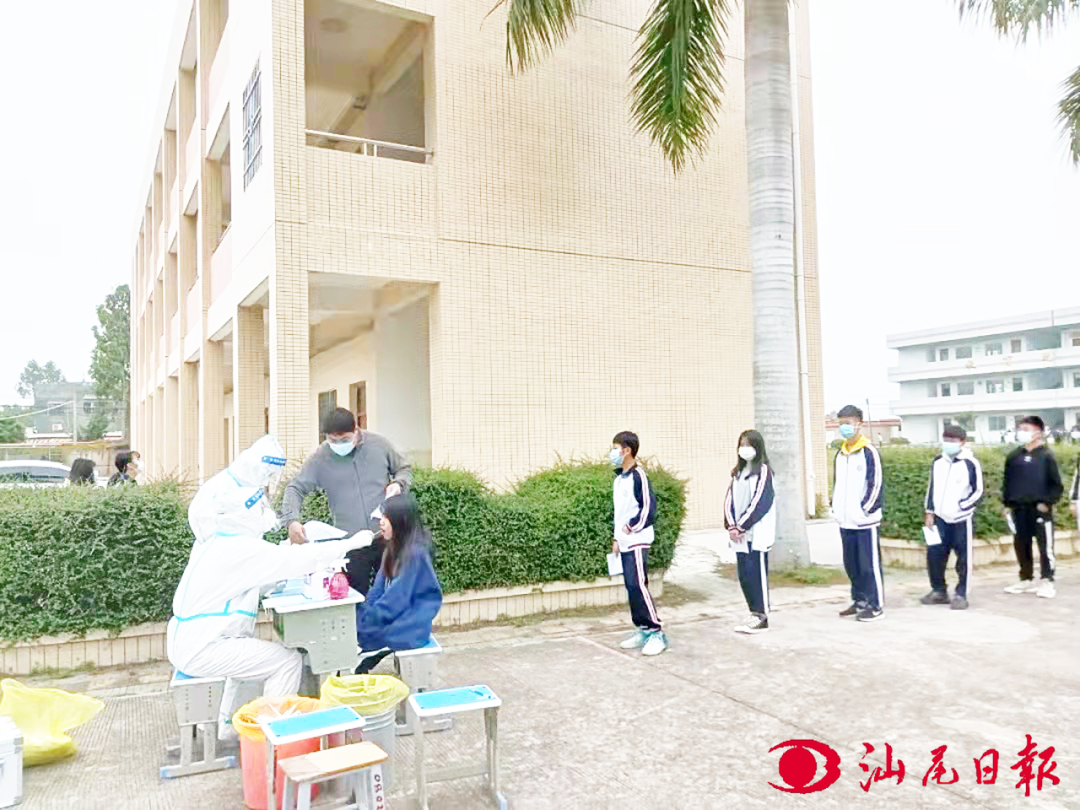 图为陆丰市潭西二中学生开学前一天在校园接受核酸检测。