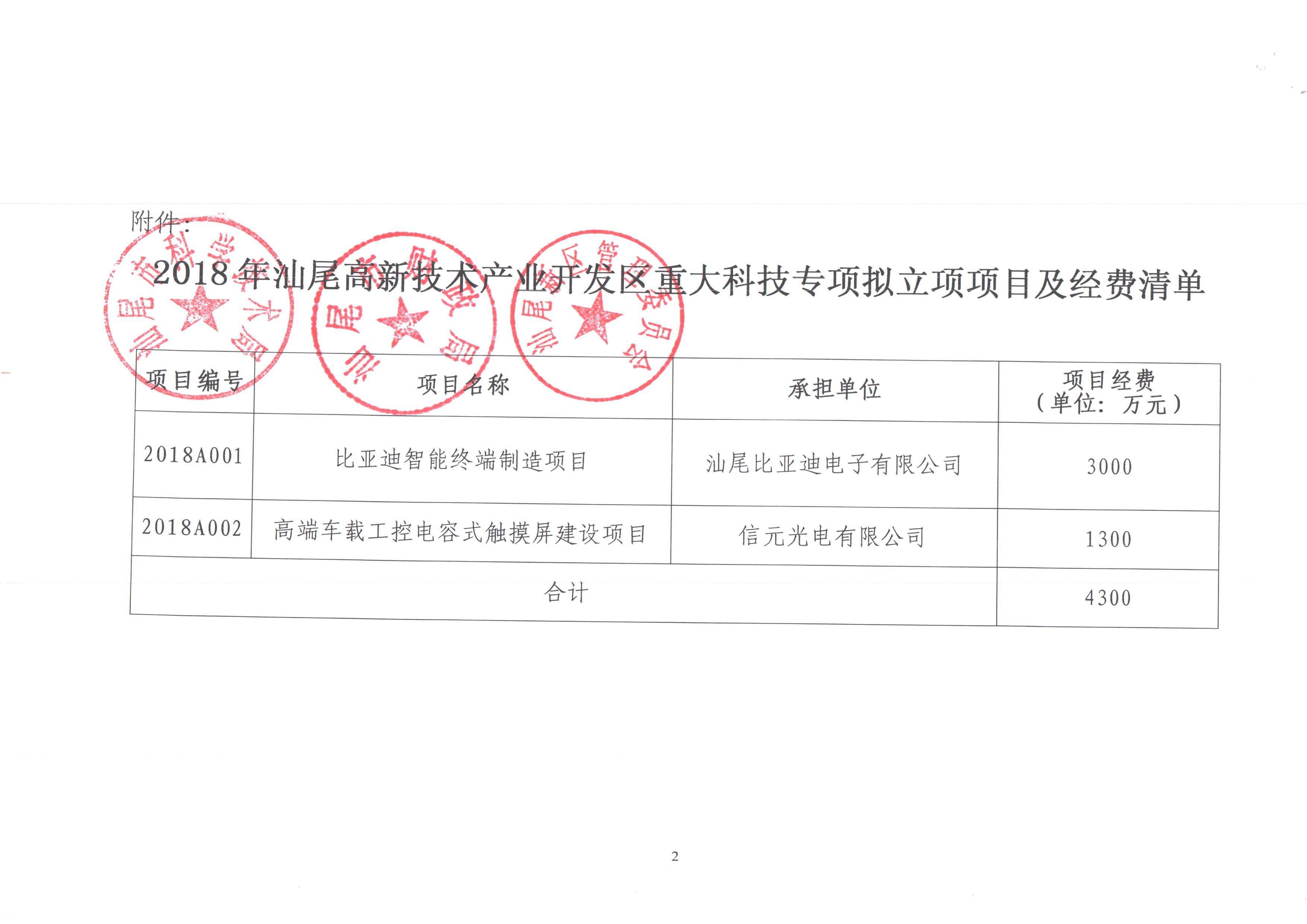 关于2018年汕尾高新技术产业开发区重大科技专项拟立项项目及经费的公示