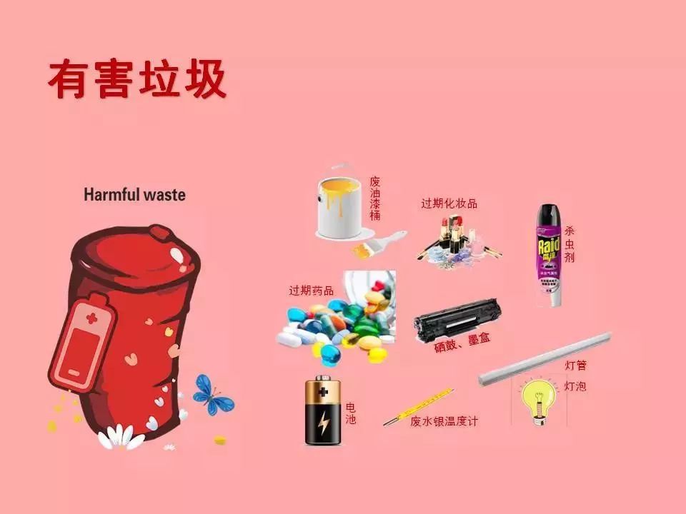 有害垃圾,指生活垃圾中对人体健康或自然环境造成直接或潜在危害的物质,必须单独收集、运输、存贮,由环保部门认可的专业机构进行特殊安全处理。(一)电池类纽扣电池、充电电池(如手机电池)。不含普通干电池(如 1号、5号、7号电池,因其生产已达到国家低汞或无汞技术要求,现作为其他垃圾投放)。(二)含汞类废荧光灯管、废节能灯、废水银温度计、废水银血压计、 荧光棒等。(三)废药类过期药品为有害垃圾,装药片的瓶子可以根据材质作为可回收物投放。(四)油漆、废农药类废油漆、废农药、杀虫剂等残余液体,需和容器一起作为有害垃圾投放。佩奇一句话,总结有害垃圾: