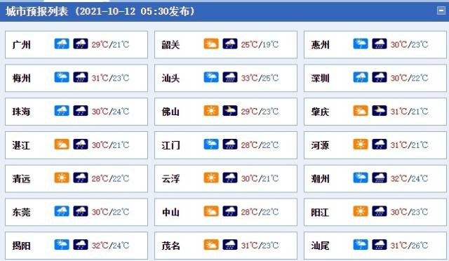 12日,梅州、河源、粤东多云转中雷雨局部暴雨,珠三角市县多云间晴转雷阵雨,其余市县多云间晴为主,有分散阵雨。
